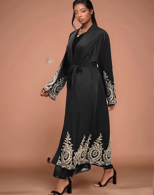 عباية مفتوحة مطرزة باللون الذهبي الفاخر | فستان إسلامي أنيق