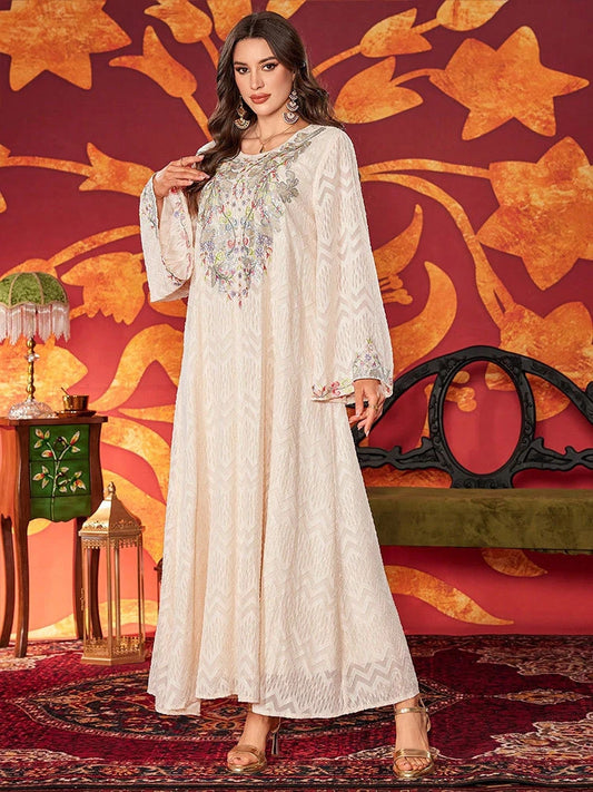عباية كتان بأكمام واسعة مطرزة بالزهور | فستان ماكسي محتشم للنساء
