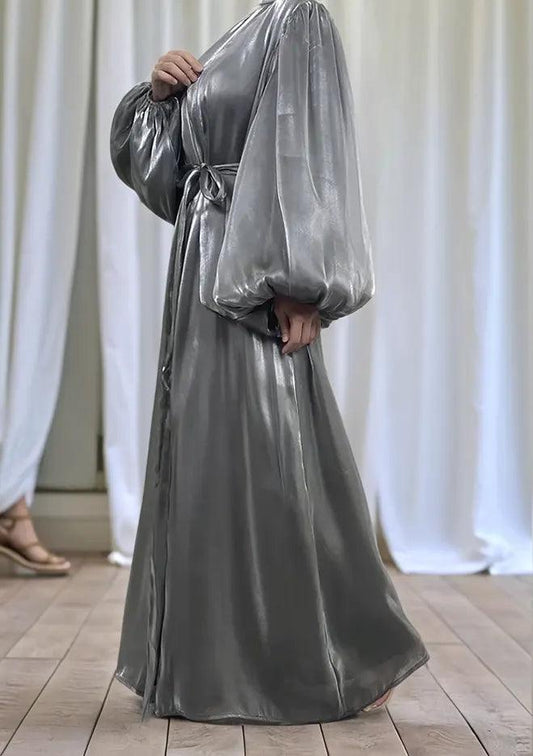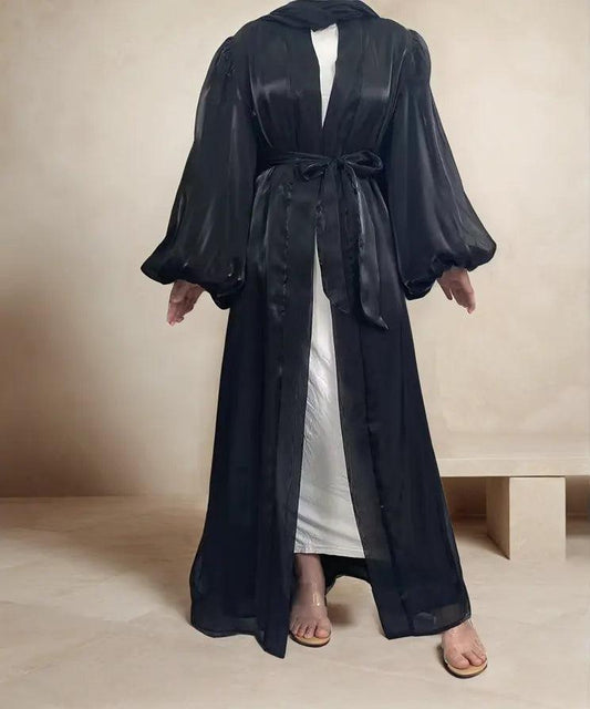 عباية العيد الفاخرة | عباية مفتوحة لامعة بأكمام منفوخة - أسود