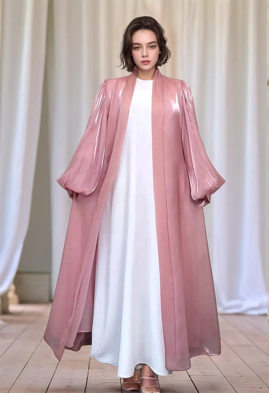 عباية العيد الفاخرة | عباية مفتوحة لامعة بأكمام منفوخة - وردي