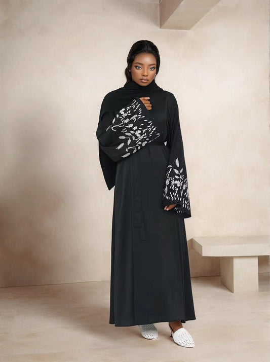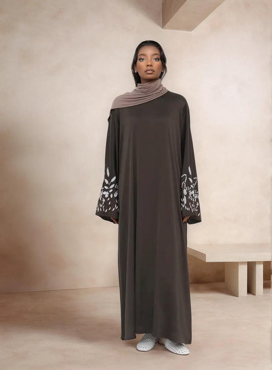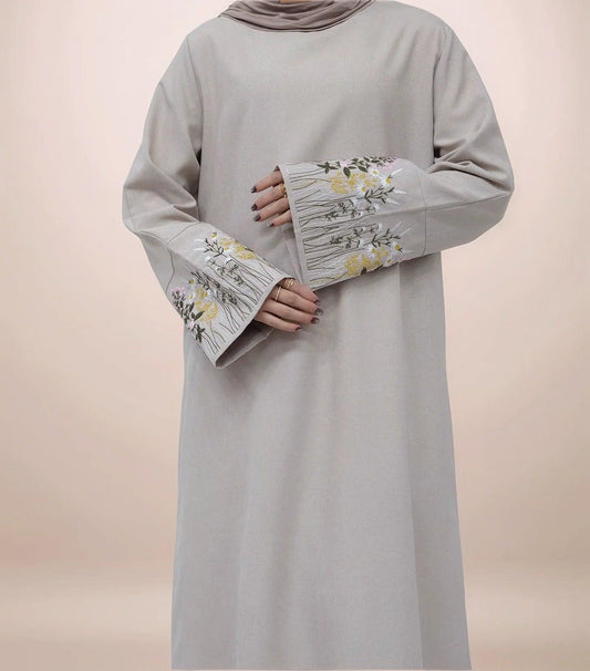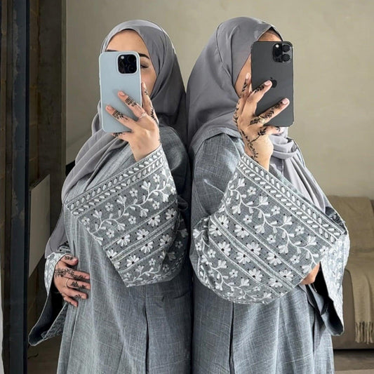 عباية كتان بأكمام واسعة مطرزة بالزهور | فستان ماكسي محتشم للنساء
