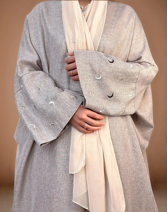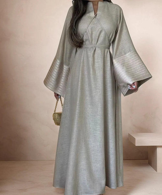 عباية كتان بفتحة رقبة على شكل حرف V وأكمام مطرزة باللون الفضي وحزام | MAHA THE LABEL