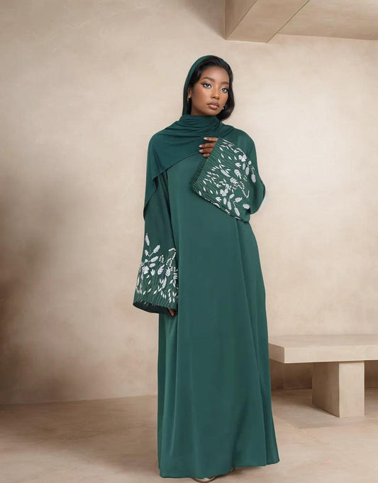 عباية قفطان مطرزة بأكمام طويلة | فستان محتشم للنساء / زمردي
