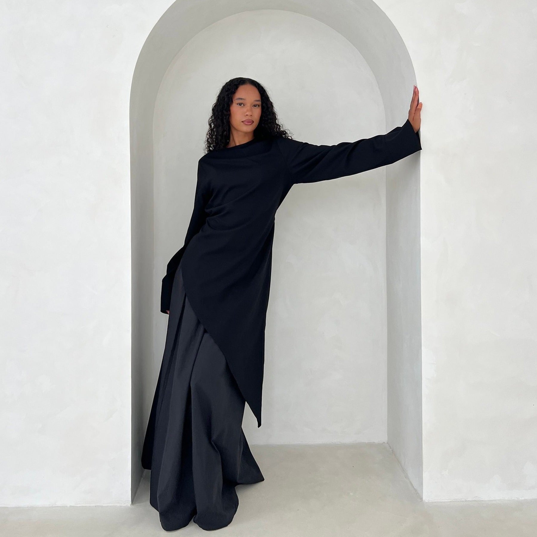 Yes — the asymmetric drape top works with trousers; the maxi skirt pairs with shirts or knitwear.