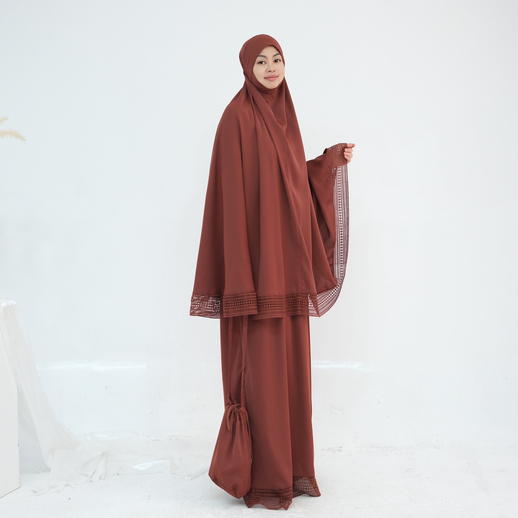 This Nida khimar prayer set is designed for effortless coverage and comfort. The four-piece modest outfit features a flowing khimar with lace trim, a matching long skirt and top layer for prayer, plus a handy drawstring bag for neat storage—ideal for daily salah, masjid visits and travel.