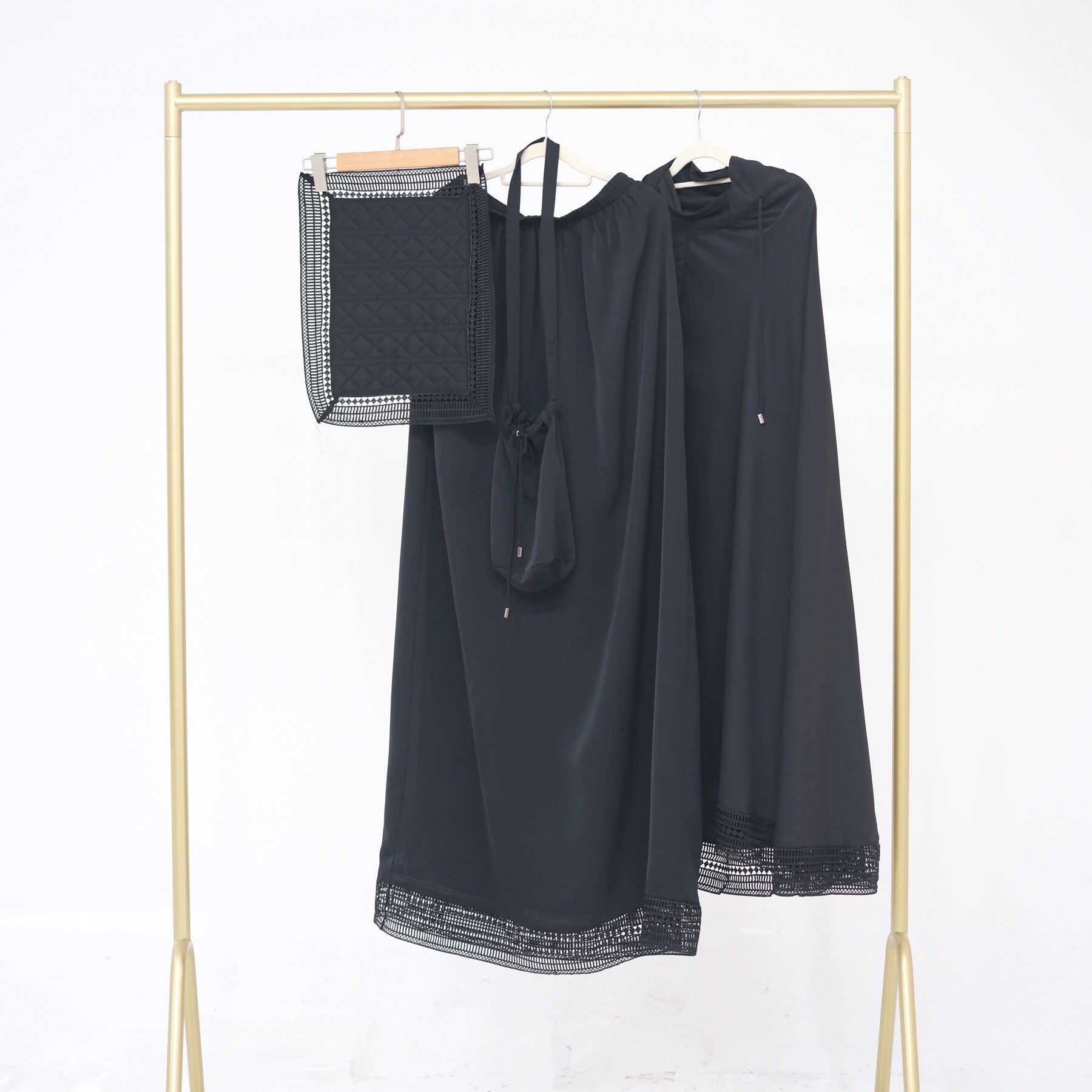 A complete 4-piece prayer outfit: khimar with lace trim, coordinating prayer top layer, matching long skirt, plus a drawstring bag for storage and travel.