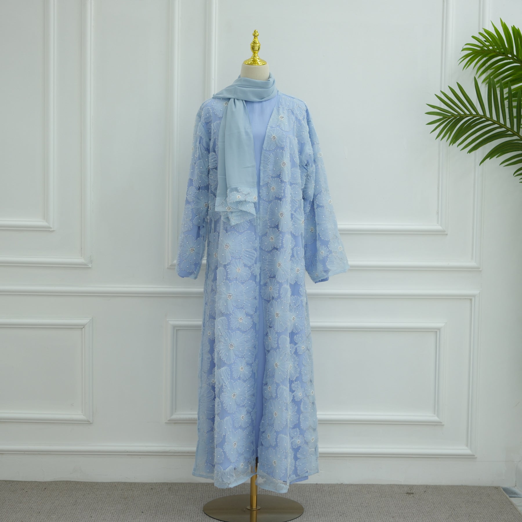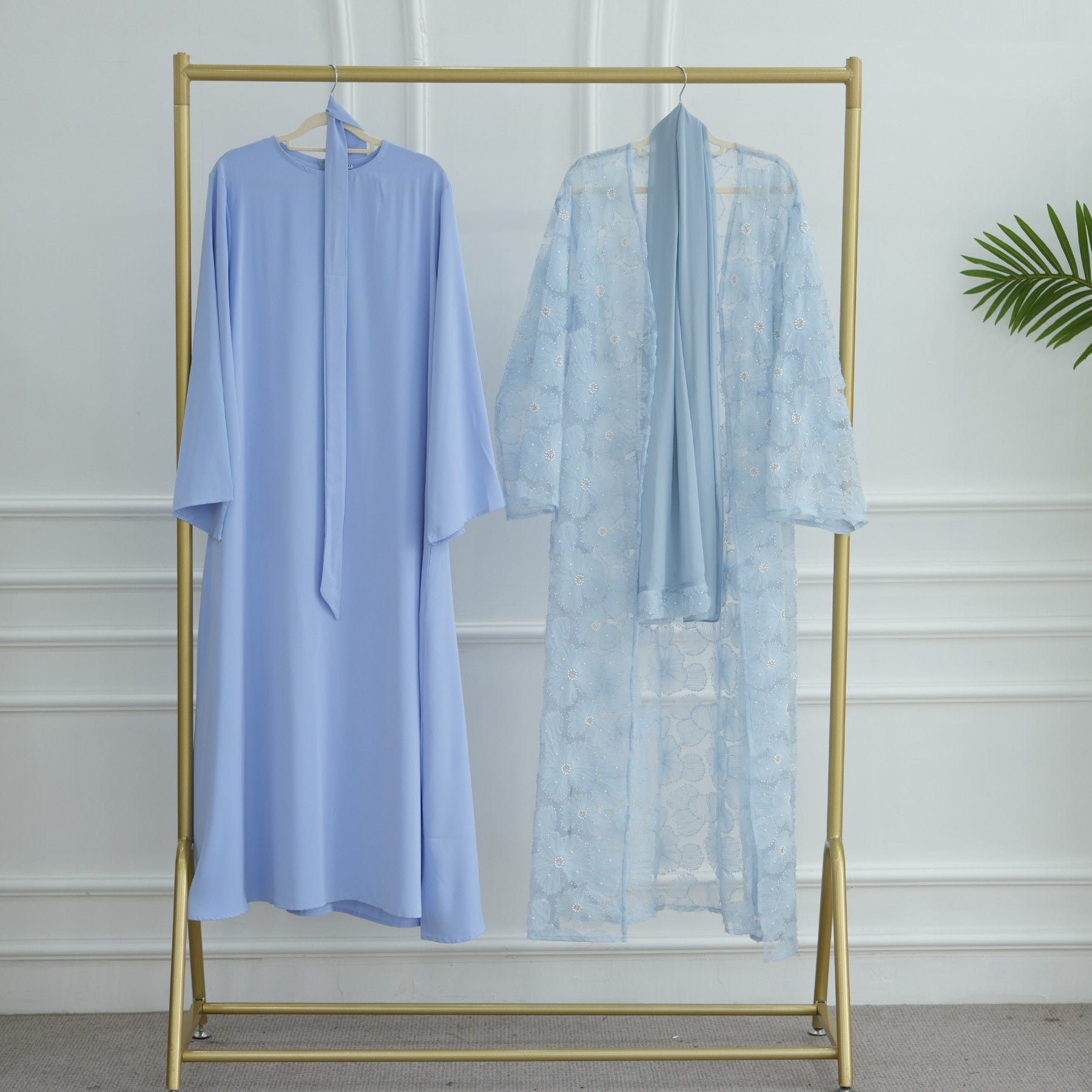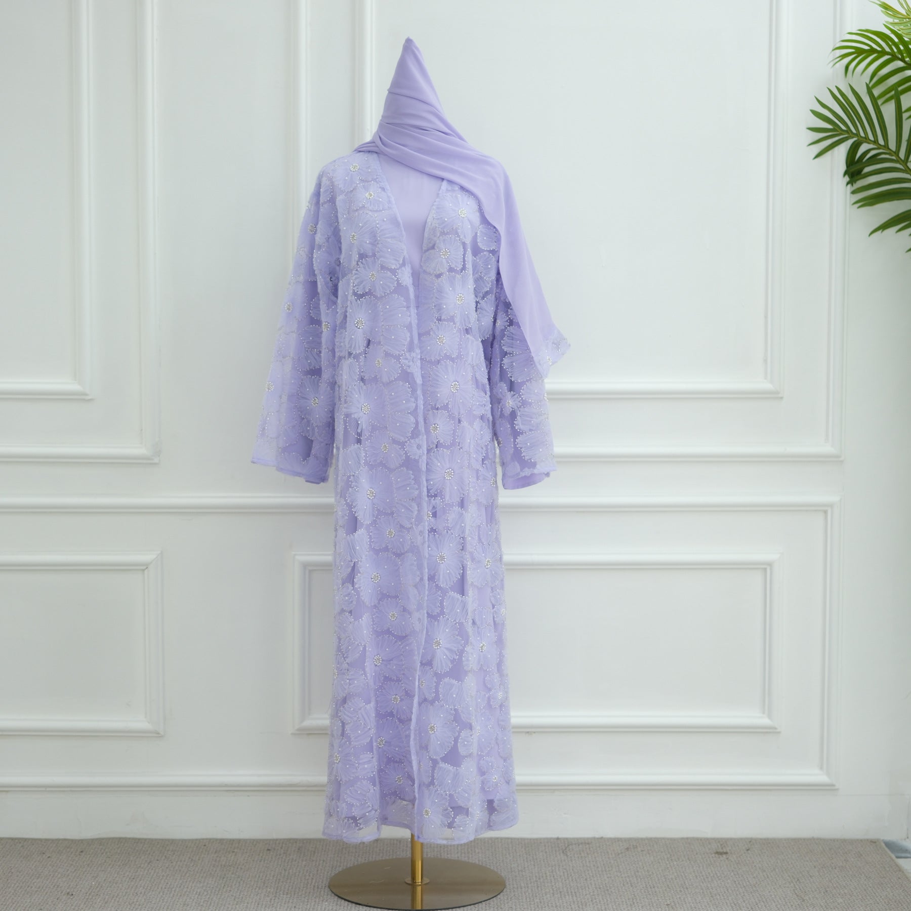 MH90 Beaded Lace Abaya Set – Embroidered Open Abaya, Optional Hijab & Inner Dress