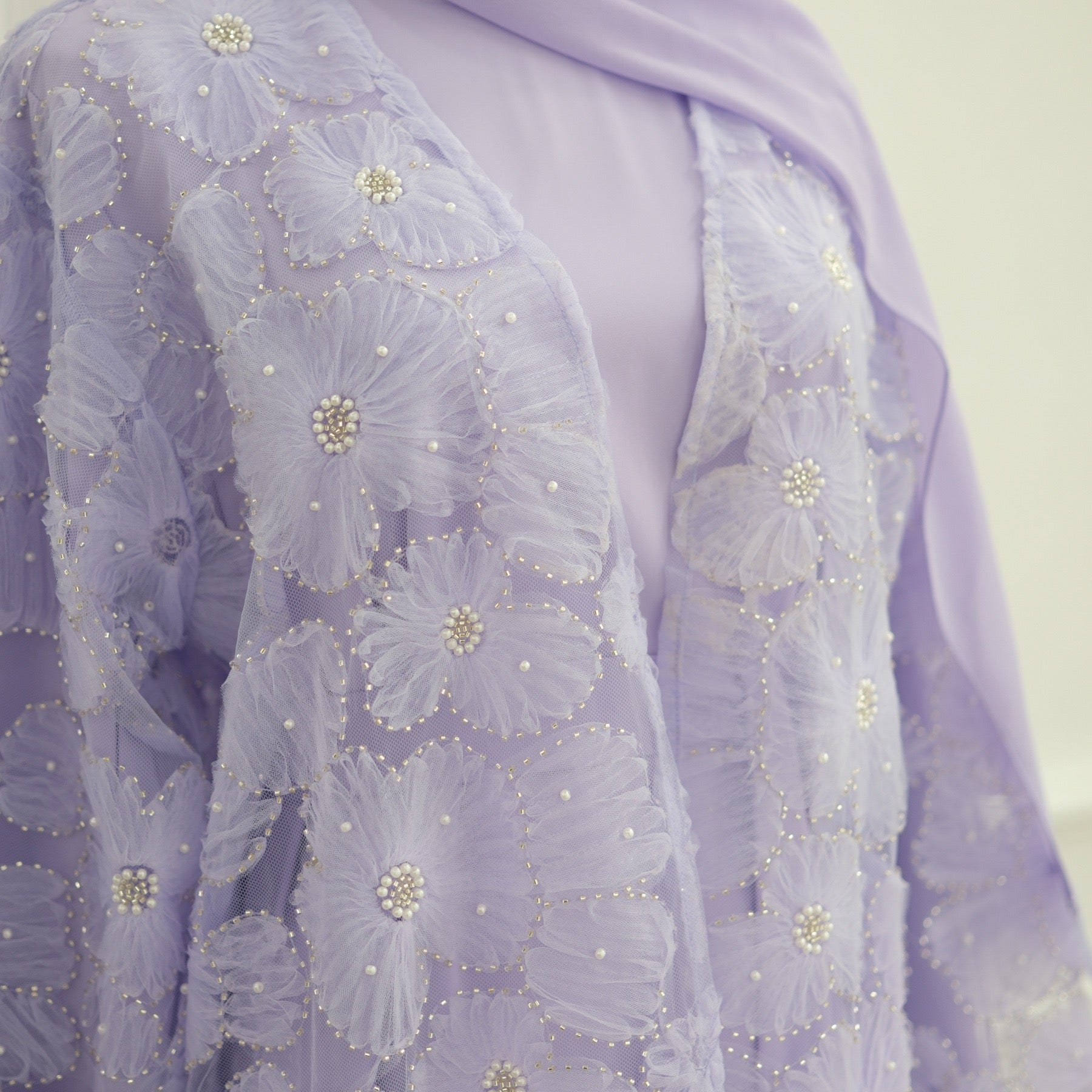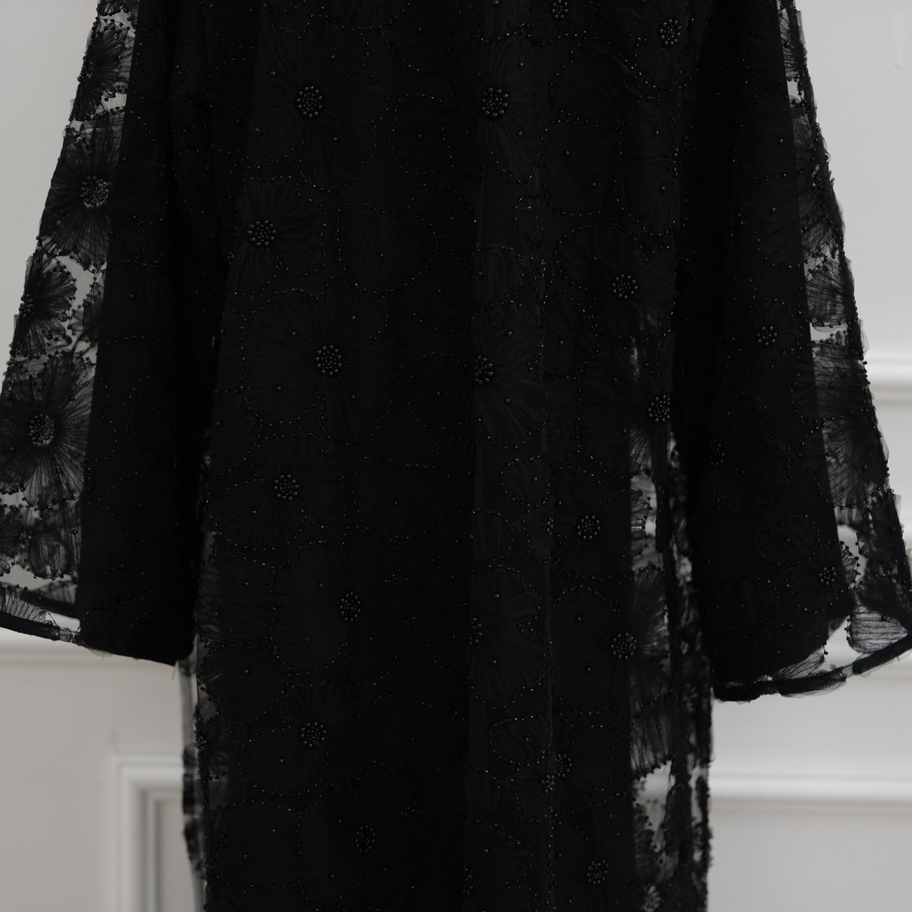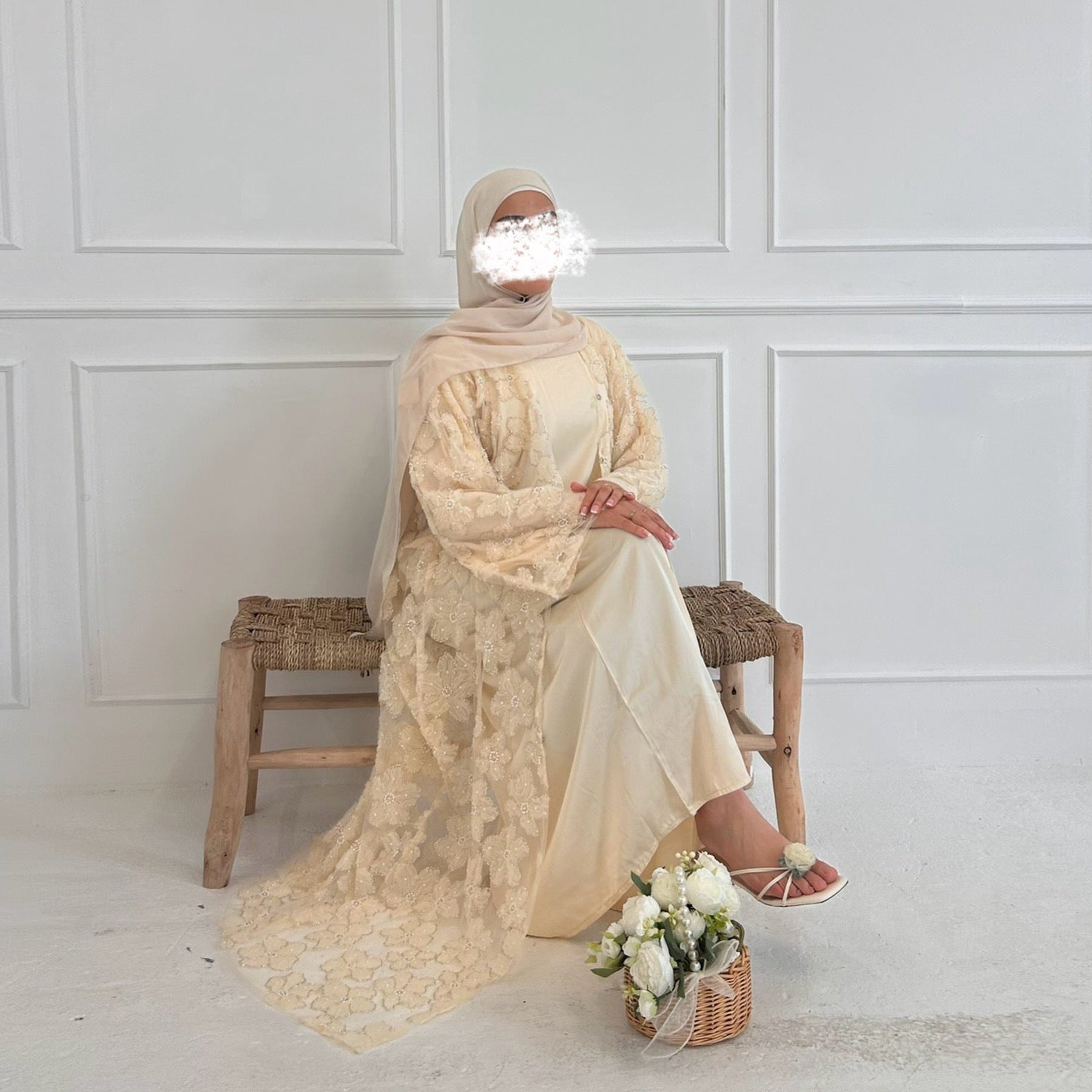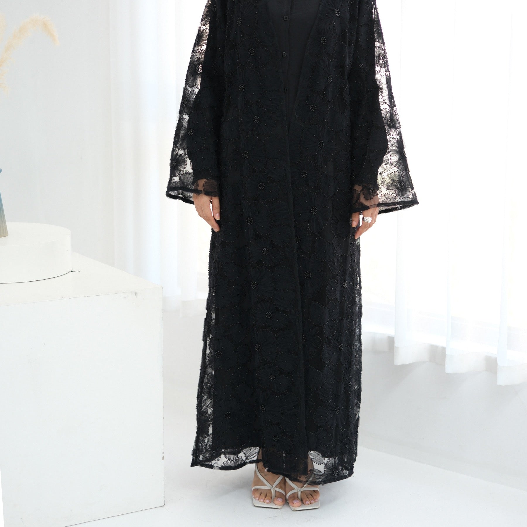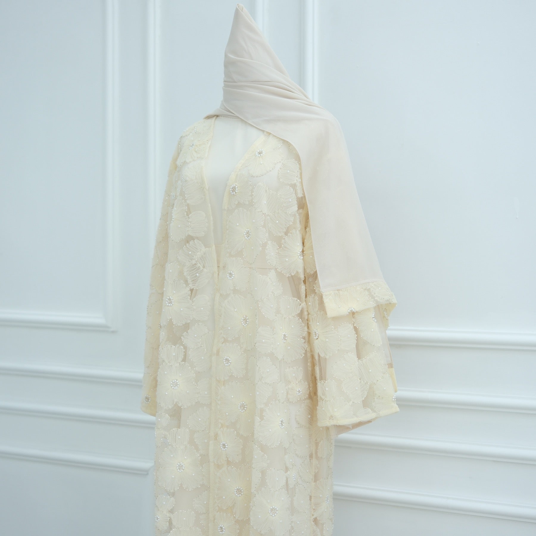 A show-stopping beaded lace abaya with dimensional floral embroidery and subtle pearl accents. This open-front style drapes beautifully for special occasions and modest eveningwear. Choose the abaya only, add a matching hijab, or complete the look with the flowing inner dress.
