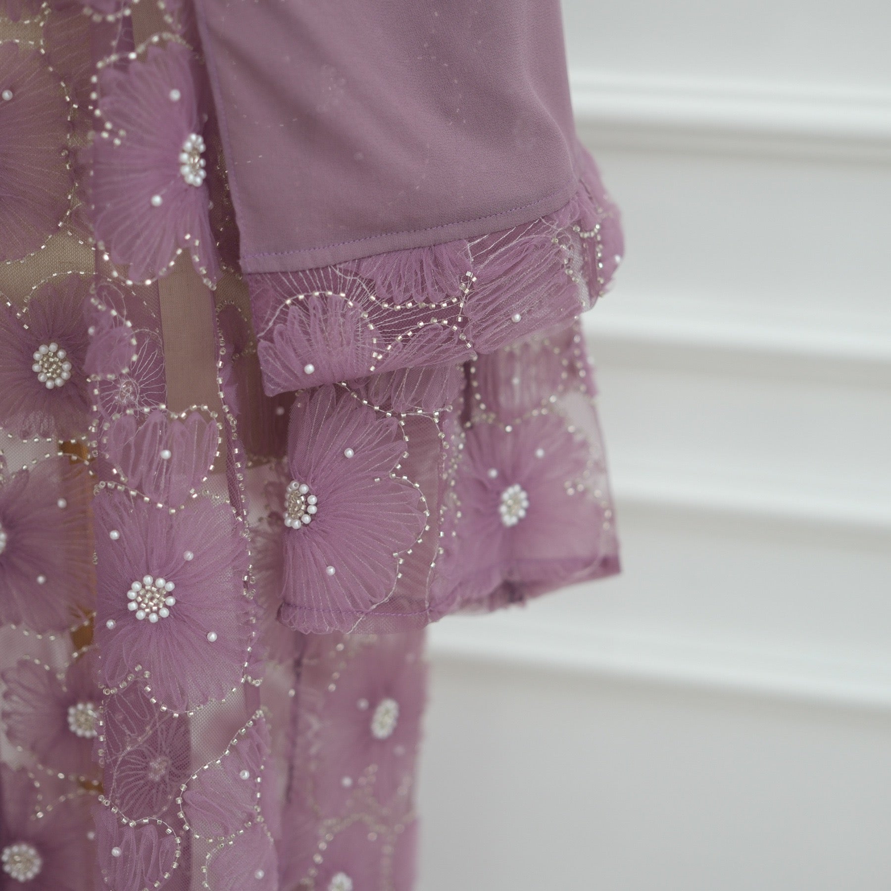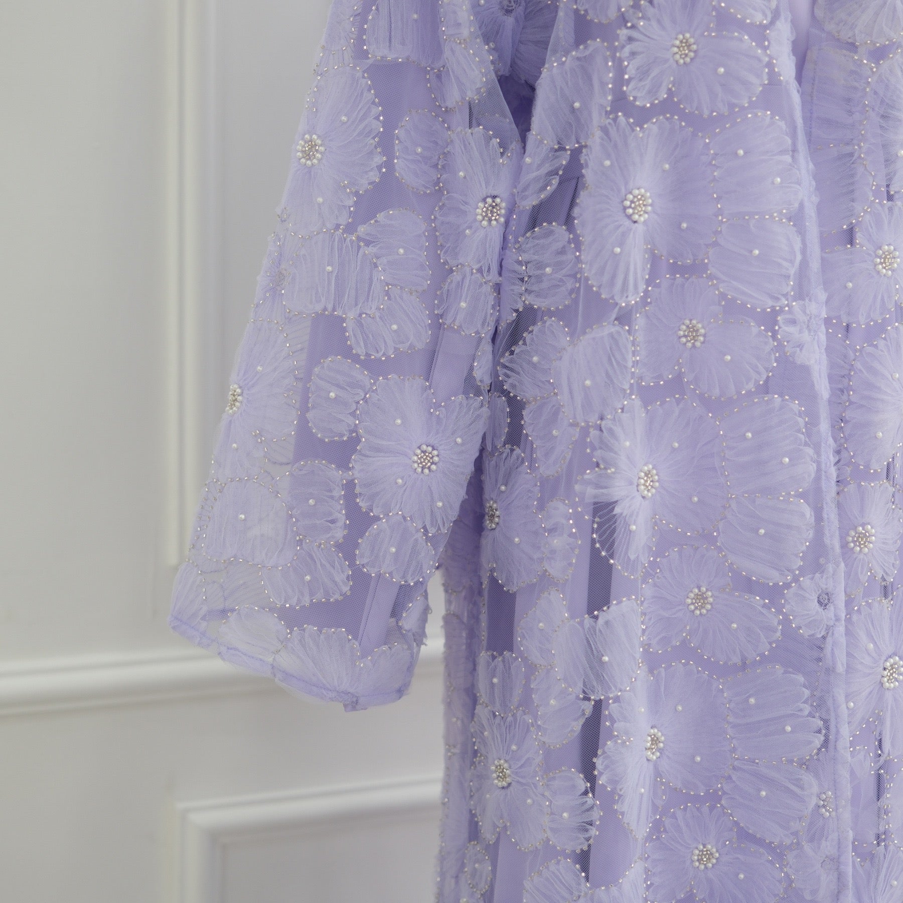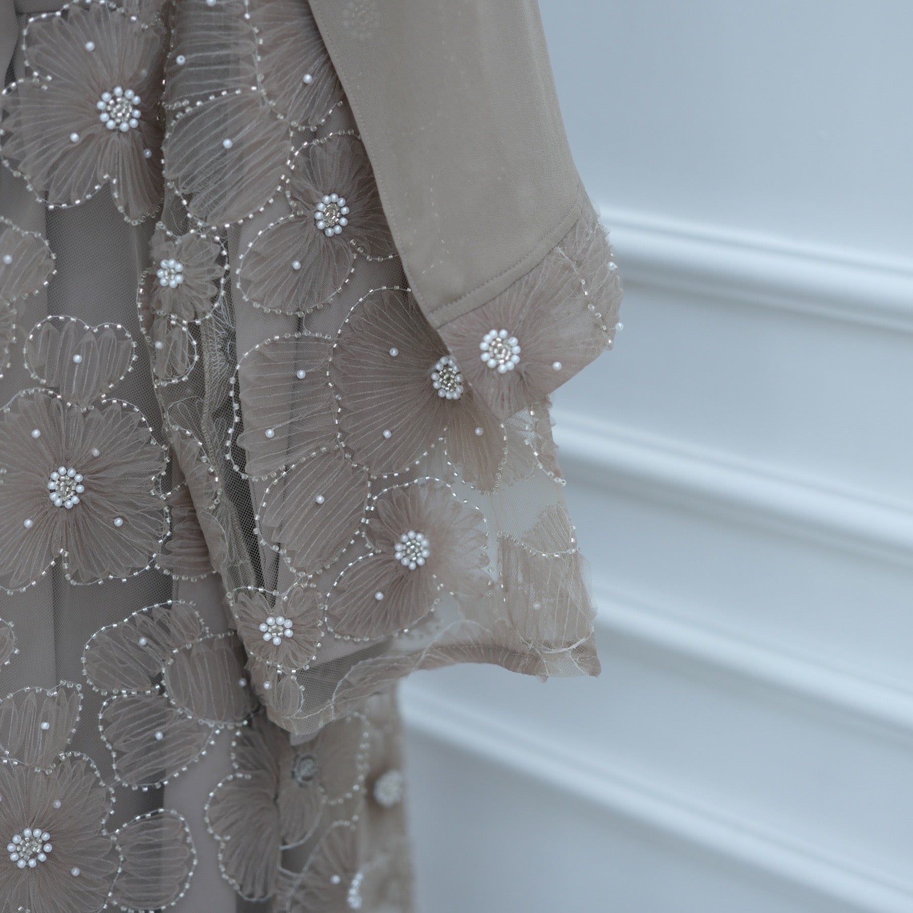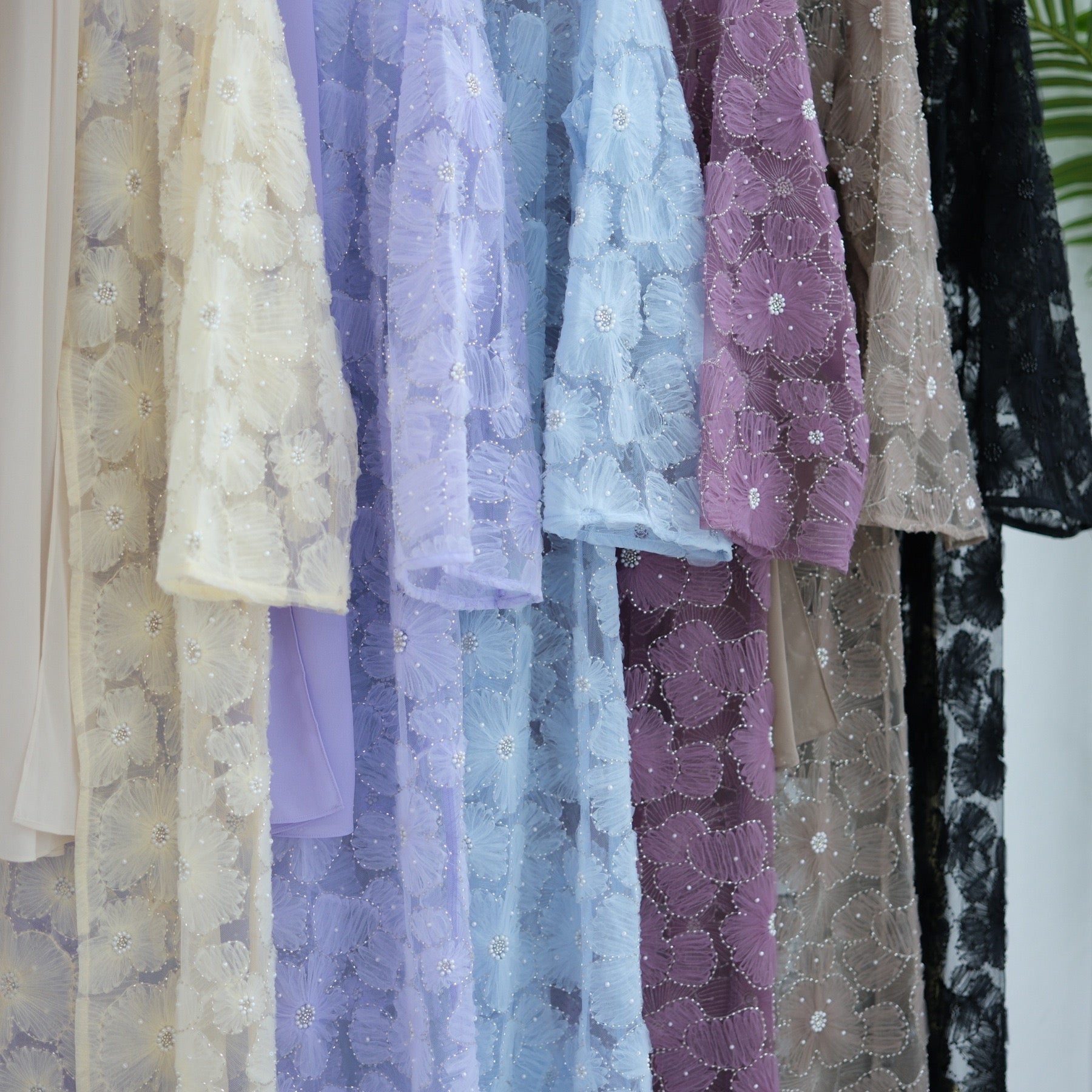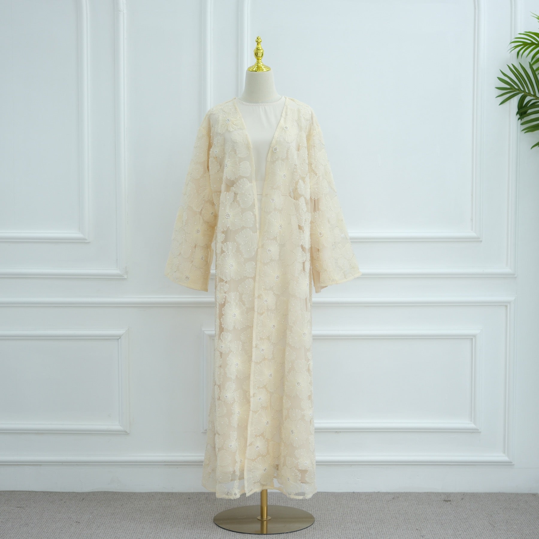 A show-stopping beaded lace abaya with dimensional floral embroidery and subtle pearl accents. This open-front style drapes beautifully for special occasions and modest eveningwear. Choose the abaya only, add a matching hijab, or complete the look with the flowing inner dress.