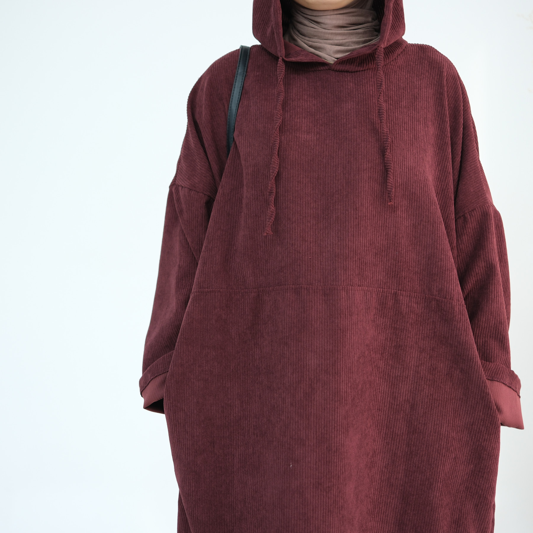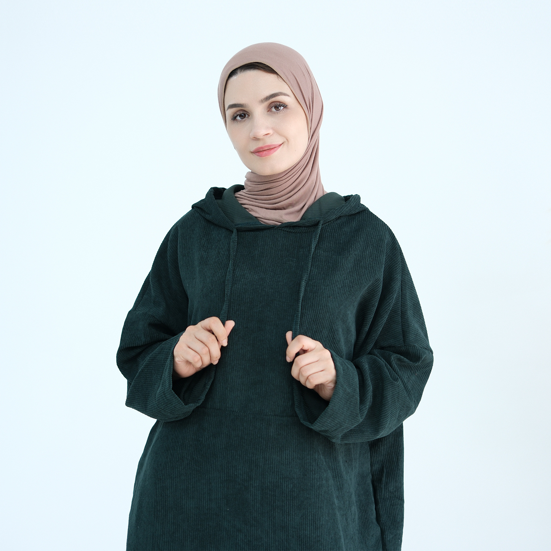 This abaya is made with premium corduroy fabric that maintains its softness and color vibrancy wash after wash. The quality construction ensures durability, while the thoughtful design details like the drawstring hood and functional pockets add both style and practicality.