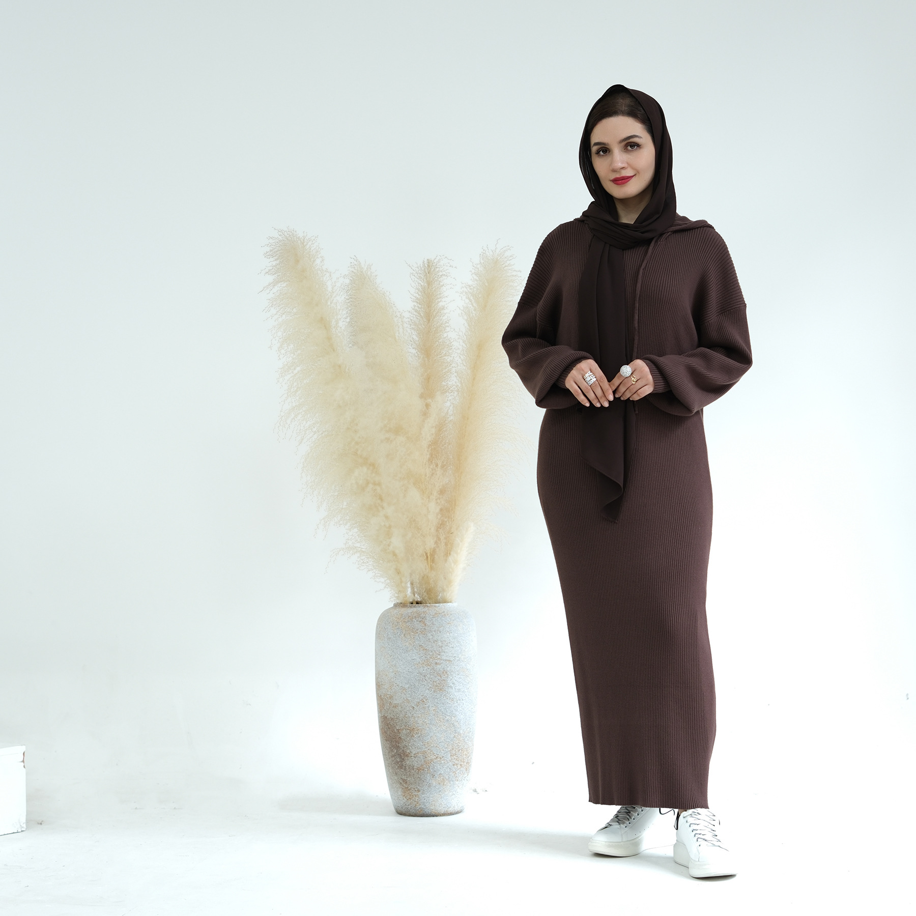 Meet MH79 Hooded Abaya for Women — a full-length, long sleeve modest Islamic dress with a cozy thick-knit oversized sweater dress look, made for winter coverage and everyday ease.