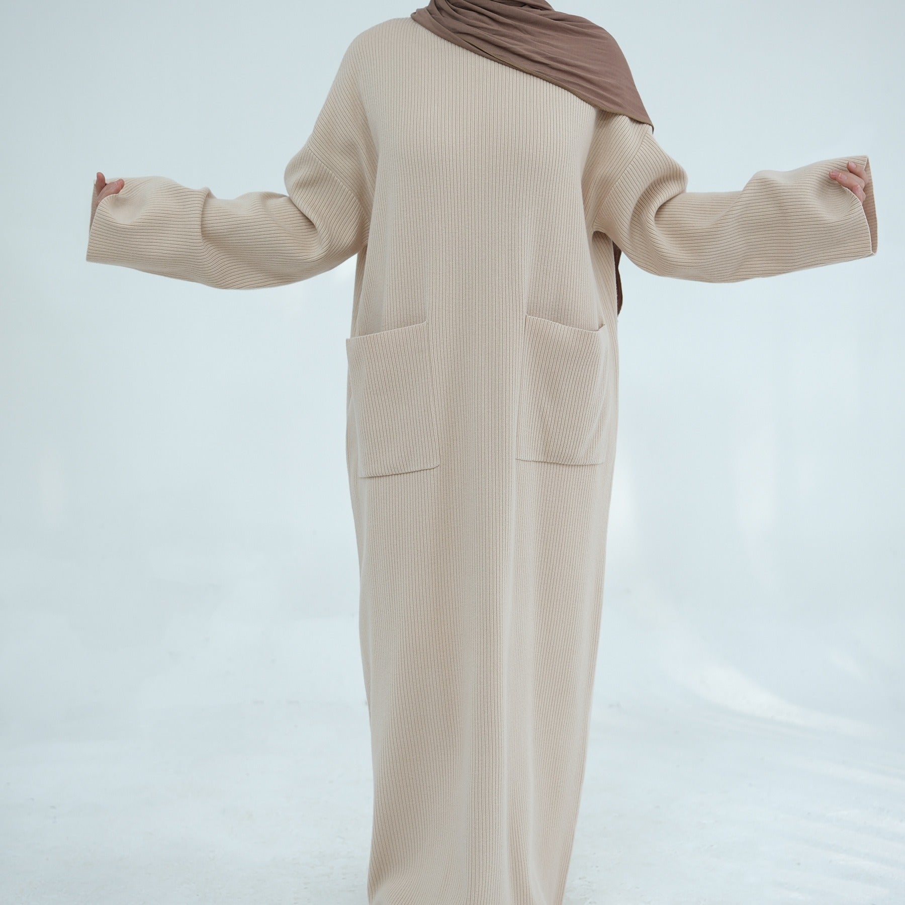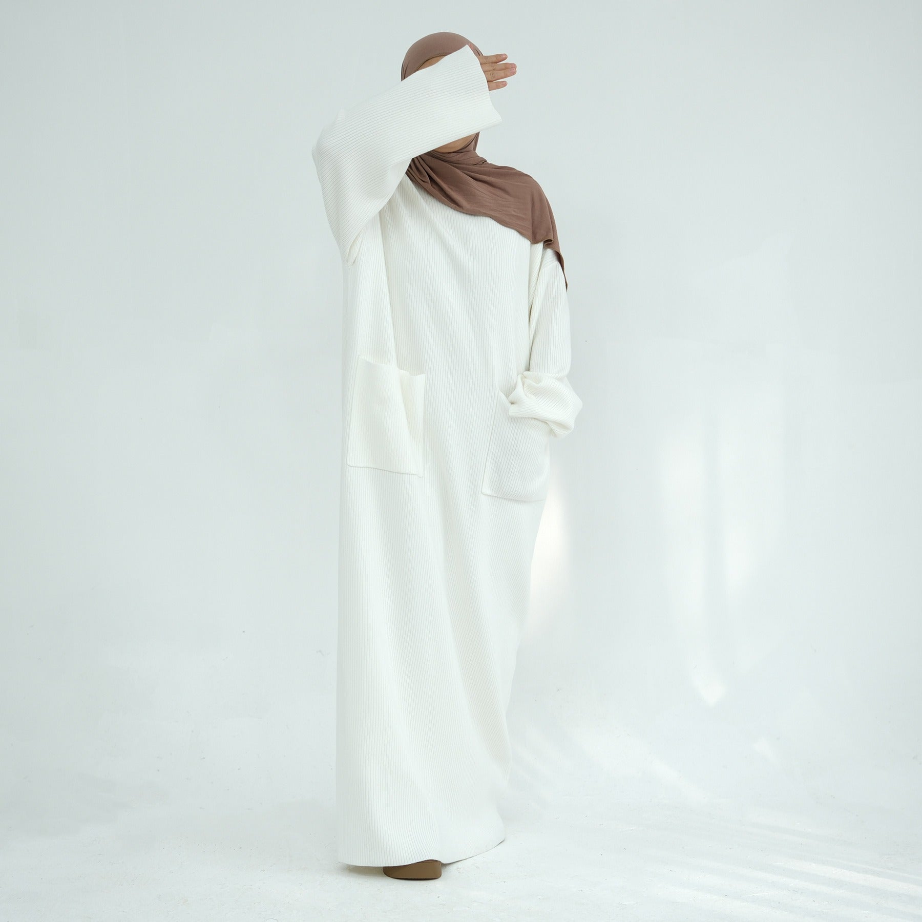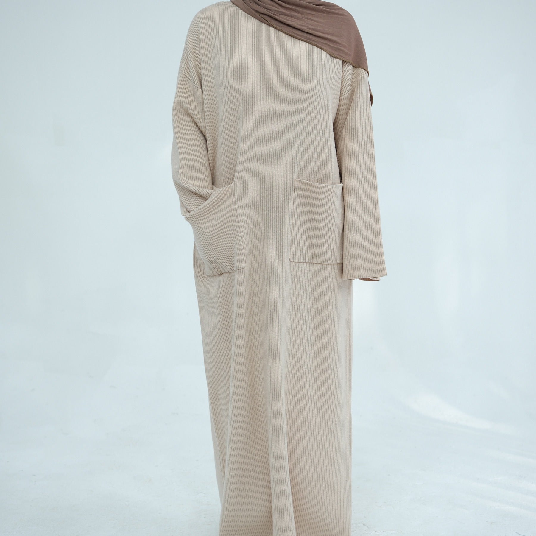 This winter abaya with pockets moves from weekday to worship. Tie the belt for a defined waist or wear loose for minimalist elegance.