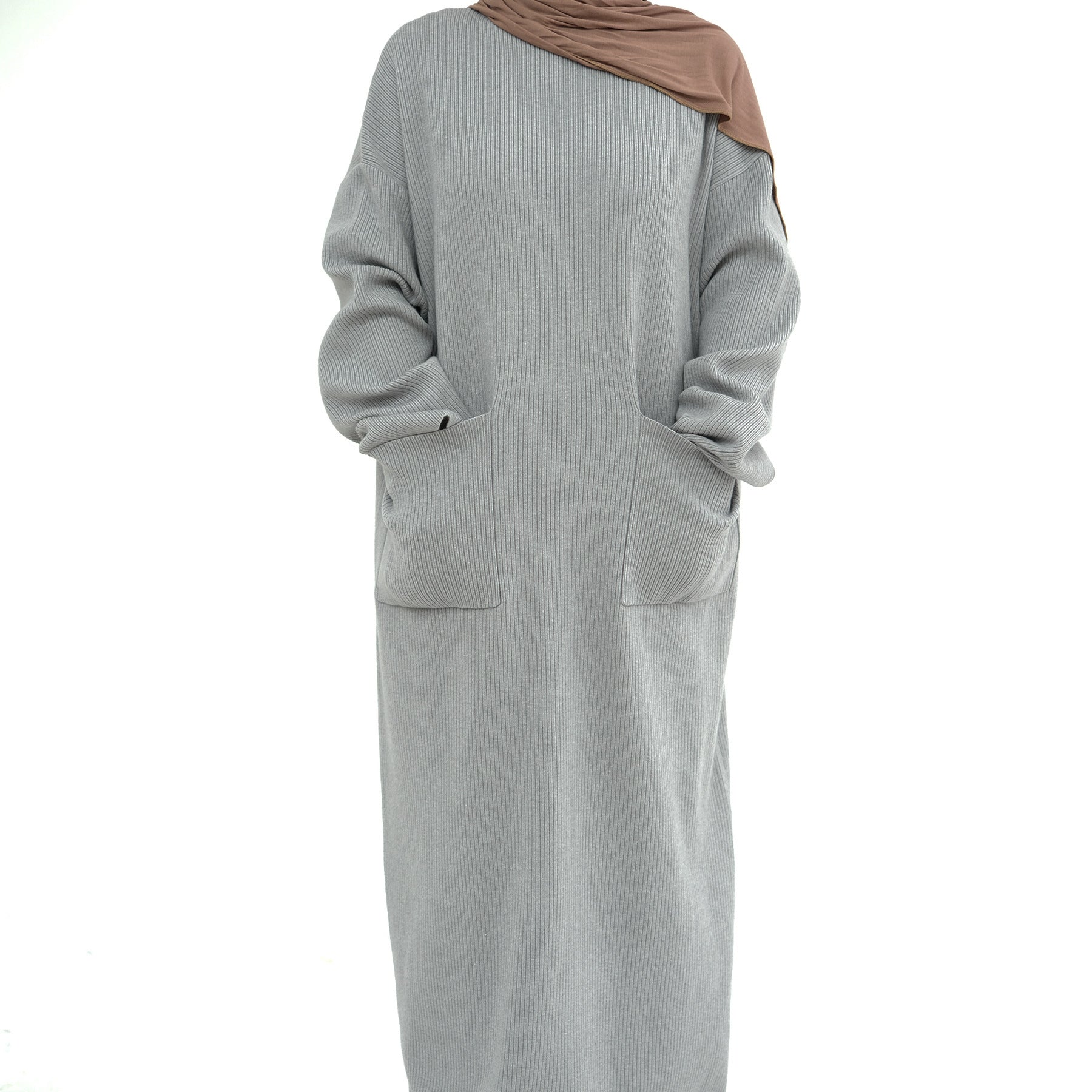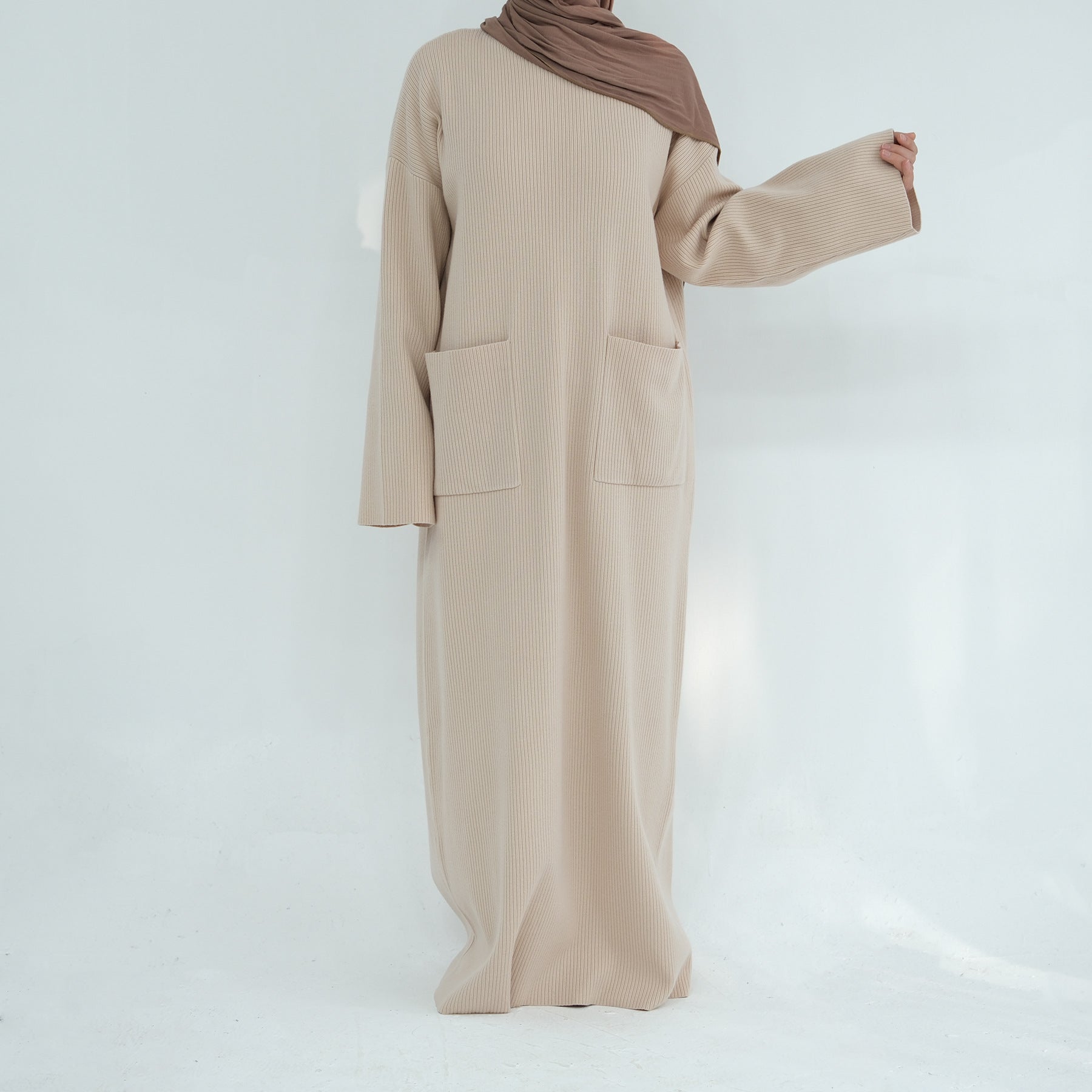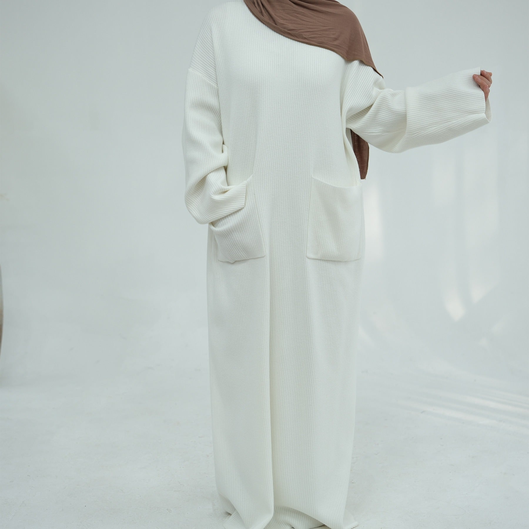 This winter abaya with pockets moves from weekday to worship. Tie the belt for a defined waist or wear loose for minimalist elegance.